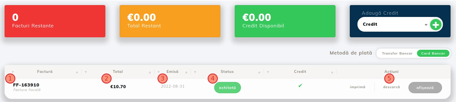 - Sljedeća stranica će prikazati postojeće fakture u klijentskom nalogu i njihov status.
